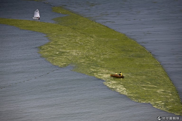 青島附近的海面上,可見小小船隻正在大片的海藻中浮沉。人類海上活動和近海養殖業發達,造成海水優氧化的情況一年比一年嚴重。而青島的海水浴場每年一到吹起南風的夏季時,頓時變成了綠油油的青草地。