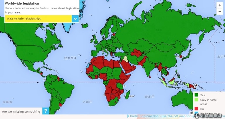 除了提醒民眾到美國玩要注意,英國外交及國協事務部也附上了一份地圖給LGBT族群參考,這份地圖由「國際LGBTI聯合會」(ILGA)製作,清楚標示出各國對於LGBT的規定程度,舉例來說,在男同志方面,台灣屬於沒有立法禁止男同志的綠色區域,而非洲有許多國家是屬於禁止的紅色區。
