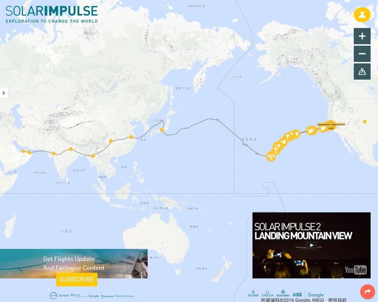 - 2015/6/28:名古屋飛往美國夏威夷,共計 117小時52分,由波許伯格完成。這段航程也打破世界紀錄,寫下以太陽能動力飛行最久且最遠紀錄。