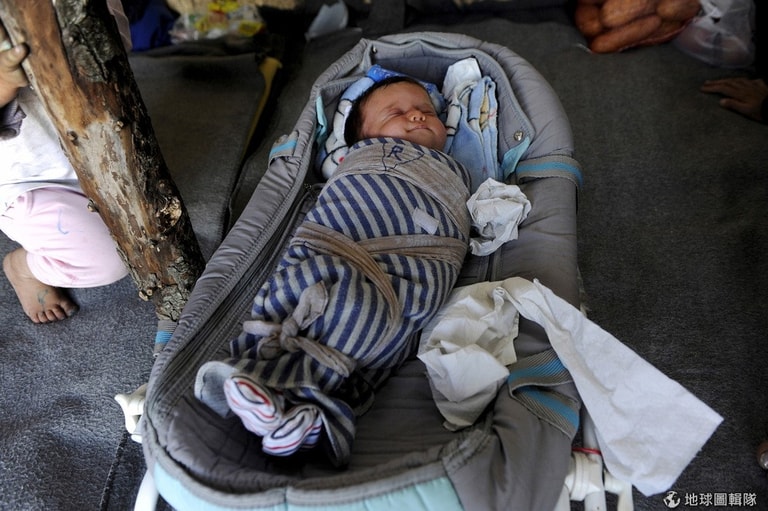21天大的難民小寶寶被包緊緊躺在衣物中,這裡是距離馬希交界處不遠的伊多梅尼。