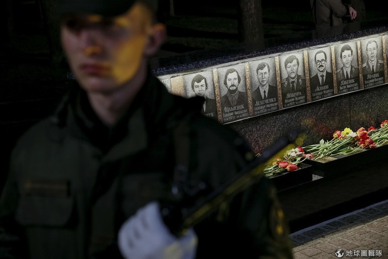 士兵站在紀念碑前,悼念核災中喪生的消防隊員和工作人員。
