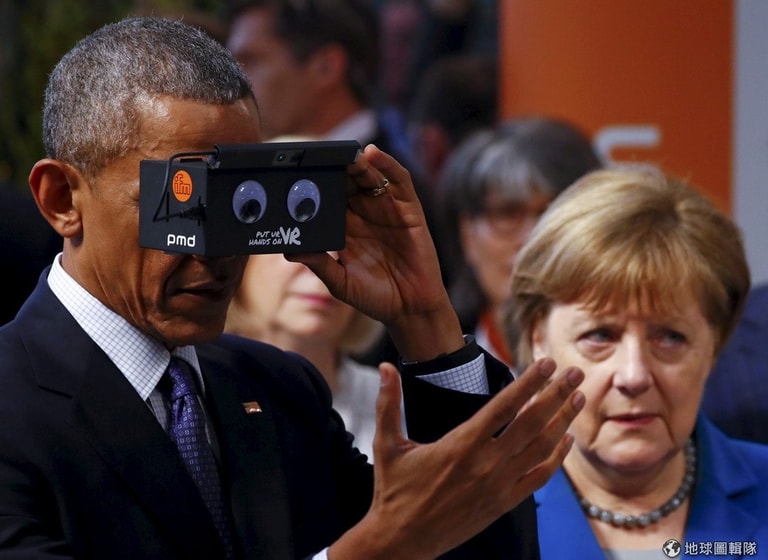 漢諾威當地,美國總統歐巴馬(Barack Obama)正體驗虛擬實境眼鏡,一旁是德國總理梅克爾(Angela Merkel)。報導指出,歐巴馬出訪盟國 6天,德國是他的最後一站,這兩位領導人希望讓仍在磋商的跨大西洋貿易及投資夥伴協定(TTIP)恢復生機。