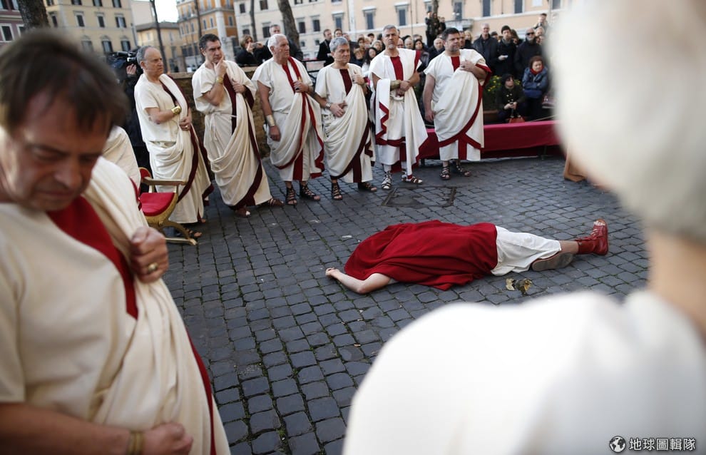 路透社民眾正在演出知名的歷史事件「三月十五日」(Ides of March),這天是凱薩大帝(Julius Caesar)遇刺的日子。