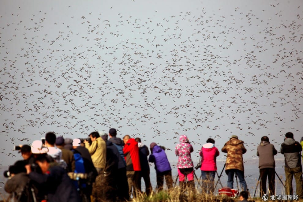 遼寧省鴨綠江畔,人們站在岸邊觀賞著成群的鴴鷸類水鳥成群飛舞。