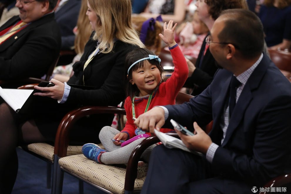 3歲的奧莉維亞(Olivia Wong)學著旁邊的爸爸的姿勢,28號這天是美國國會的「帶孩子上班日」。