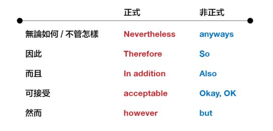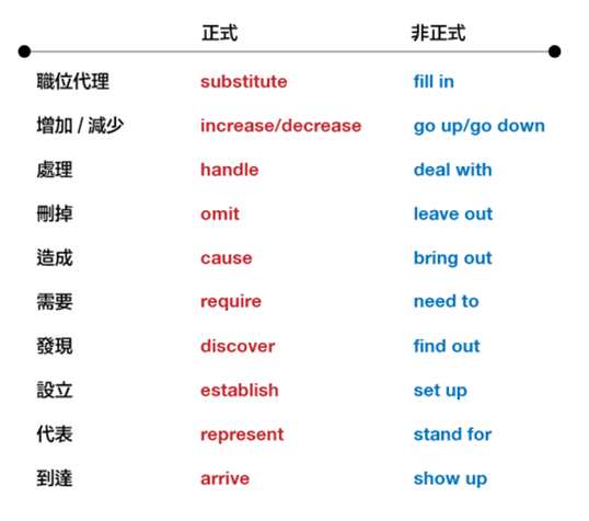 其實正式和非正式比語感來得單純,在慢慢培養語感之前,先抓到幾個關鍵,搭配這裡幫你整理的對照表,一點都不需要擔心太正式或不夠正式的問題:
