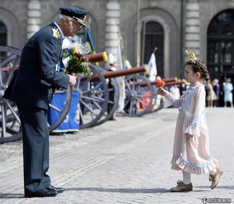 瑞典國王古斯塔夫(King Carl XVI Gustaf)站在宮廷外,接受一位小女孩的祝賀,當地在 30號時慶祝國王 70歲生日。