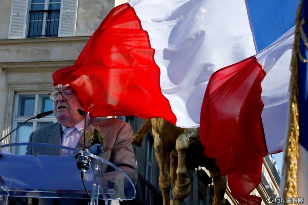 法國「民族陣線」黨(National Front)的尚馬利雷朋(Jean-Marie Le Pen)在巴黎第一區的金色聖女貞德(Jeanne d’Arc)雕像前舉行演說,一陣風吹來擋住了雕像和他的半邊臉。