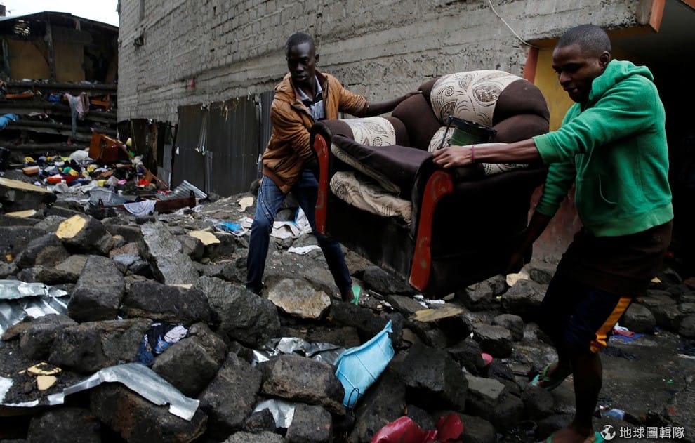 奈洛比胡魯馬(Huruma)區,發生大樓倒塌的現場可見民眾正把現場的沙發搬走。報導指出,蓋在靠近河邊的六層高大樓在 30號時傳出倒塌,這棟大樓內住了超過 150個家庭,不久前大樓曾因建築結構不安全預定要拆毀,但大樓只蓋了兩年左右讓居民忽視了警告,事件過後大樓主人遭到通緝,樓主最後也自首投案。