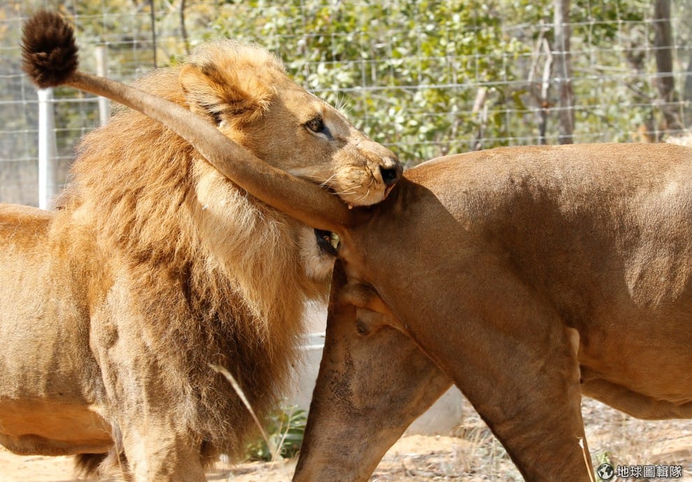 南非北部的伊姆亞大貓保護區(Emoya Big Cat Sanctuary)中,兩隻從馬戲團救出的獅子玩耍中。報導指出,國際動保協會從祕魯和哥倫比亞拯救出 33頭馬戲團獅子,在 29號時搭上飛機從秘魯飛往南非,回到牠們應該生活的非洲草原。此次運送堪稱大型貓科史上最大規模的一次空運行動。