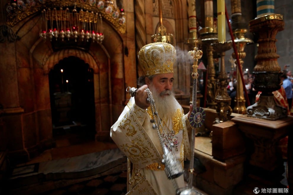 舊城區的聖墓教堂(Church of Holy Sepulchre)中,可見耶路撒冷牧首(Greek Orthodox Patriarch of Jerusalem) 狄奧菲洛三世法座(Metropolitan Theophilos)帶領東正教信眾慶祝復活節,聖墓教堂據說是耶穌基督當年在下葬前塗抹香膏(Anointing)的地點。
