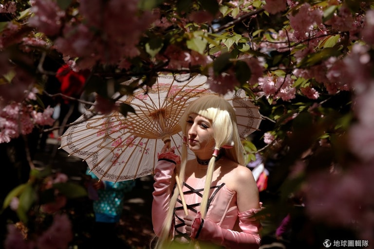 紐約的布魯克林植物園正舉辦櫻花祭,綻放花海中可見精心打扮的民眾。