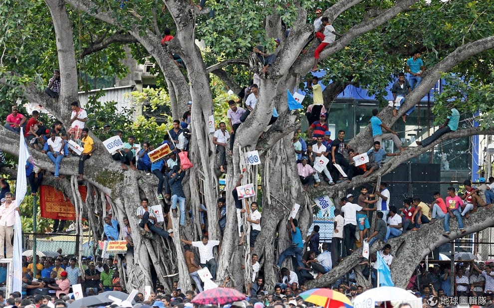 可倫坡市區內,人們坐在樹上和樹旁,看著大街上的五月一日大遊行,這場活動是由當地的「反對派聯盟」(Joint Opposition)策畫。