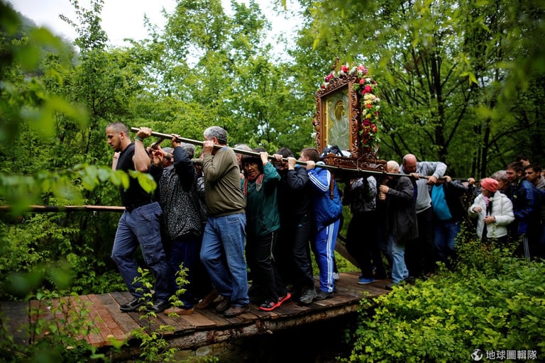 慶祝復活節的東正教信眾們,一起抬著聖母瑪利亞的肖像遊行中。