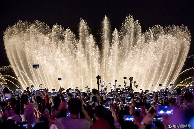 浙江省杭州,人們舉著手機記錄巨型水池的噴泉秀。