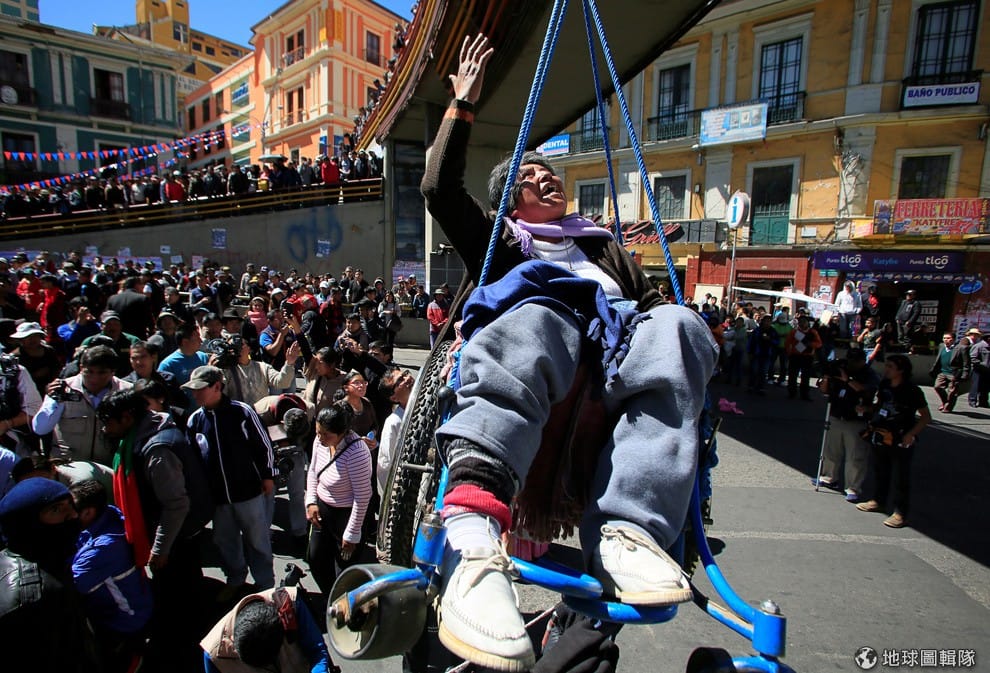 全球最高的首都拉巴斯(La Paz)當地,要求政府提高身心障礙補貼款的民眾上街示威,其中一位身障者在其他人的協助下被吊上半空。