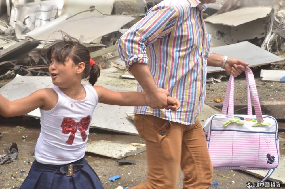 遭到轟炸的阿勒坡城內,大人抓著小妹妹往安全的地方疏散,他們所住的地方由敘利亞政府把持,在 3號時遭到反政府軍轟炸。