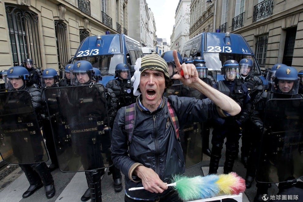 巴黎市區內,抗議勞工法不公的民眾拿著雞毛撢子在成排的憲兵前大吼。