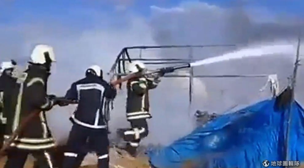 消防員在遭到空襲的難民營滅火。