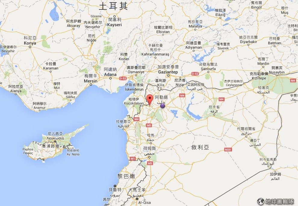 圖中紅色標籤是遭到攻擊的薩馬達鎮,位置靠近土耳其邊界。紫色圓點是敘利亞大城阿勒坡。