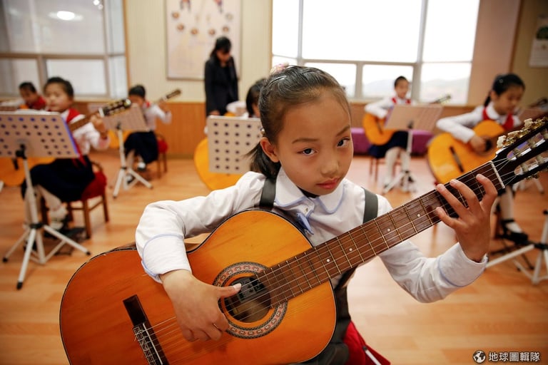 位在平壤的「萬景臺學生殿堂」(Mangyongdae Children's Palace)中,可見小女孩彈吉他練習中。