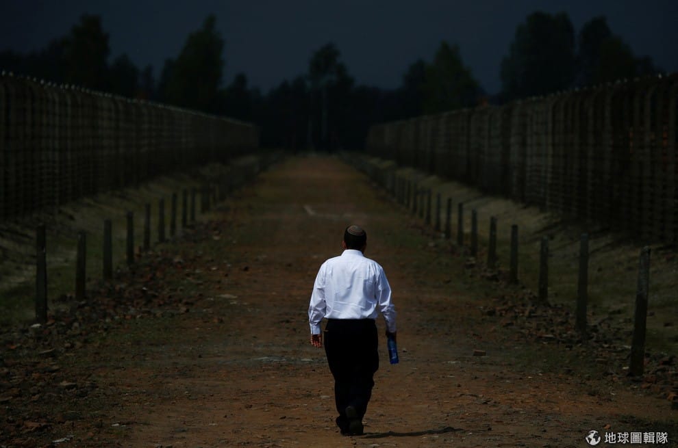 男子走向曾是猶太人遭殺的奧斯威辛集中營( Auschwitz-Birkenau),波蘭當地在 5月5日這天舉辦年度猶太生存者大遊行(March of the Living),悼念在大屠殺中喪生的人們。