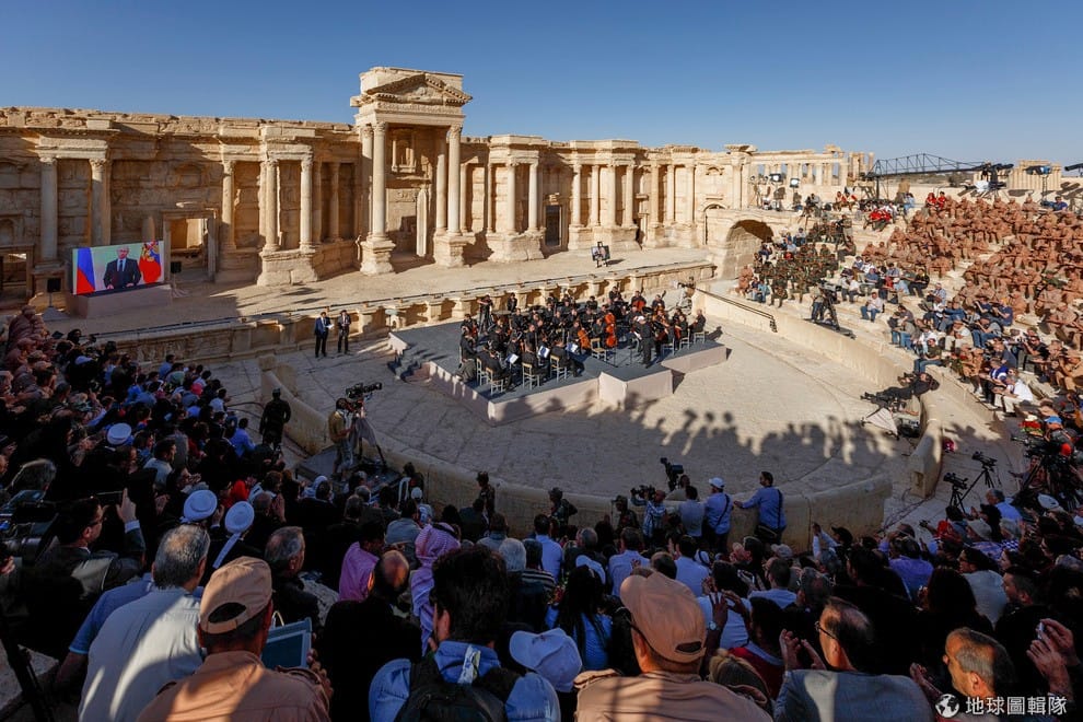敘利亞古城帕米拉(Palmyra)當地,可見俄國軍人和民眾一起欣賞著知名馬林斯基劇院(Mariinsky Theatre)演奏表演。報導指出,俄國在 3月間發動空襲,協助敘利亞政府軍擊退占領帕米拉的激進組織伊斯蘭國(IS),不久便結束了在敘利亞的軍事任務。一個多月後,俄國馬林斯基劇院管弦樂團造訪帕米拉,帶來了撫慰人心的音樂會。