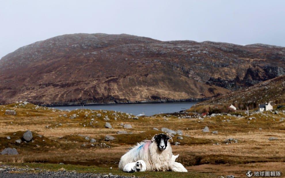 蘇格蘭的劉易斯-哈里斯島(Lewis and Harris)上,可見母羊帶著小羊坐在地上。蘇格蘭近期因為是否要再舉辦獨立公投陷入議論。