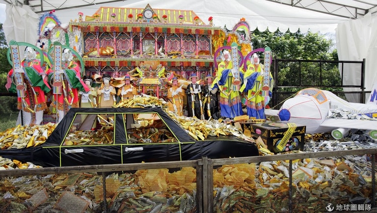 在台灣,燒紙紮用品給過世的親人用是一個歷史悠久的傳統,紙紮的樣式眾多,從日常用品的化妝品、襪子、假牙,到象徵奢華的別墅、車子、智慧型手機、名牌包等等各種紙紮用品都有,而在香港也有一樣的傳統。