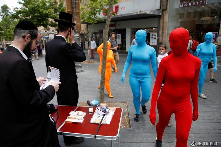 耶路撒冷的表演藝術團體(Prizma Ensemble)走過街上,與一身黑的猶太正教信徒形成強烈對比。根據表演藝術團體的粉專,他們希望幫助大眾尋求真正的自我,並對社會中敏感的議題進行探討。