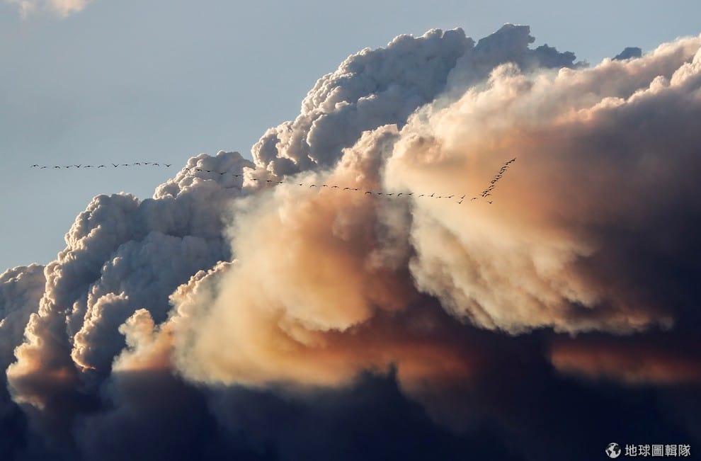 群鳥飛過驚人的灰煙。加拿大中部艾伯塔省(Alberta)的麥克默里堡(Fort McMurray)遭遇森林大火,影響面積大約 850平方公里,相當於三個台北市那麼大。