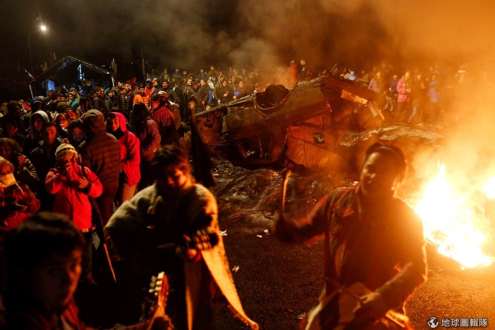 來自奇洛埃島(Chiloe island)漁夫們擋住道路示威抗議中,他們要求政府解決近日海藻增生傷害他們捕魚收入的問題。