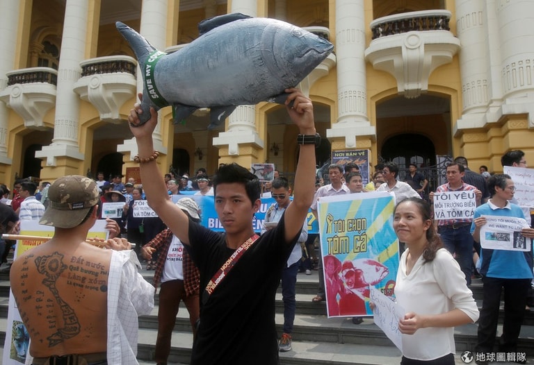 1個月前,越南的河靜(Ha Tinh)省沿岸出現大量死亡的魚群,大群死魚也被沖刷到其他 3個越南省份的海岸邊,綿延長達 200公里。示威者懷疑,魚群的死亡是因為當地的台塑河靜鋼鐵廠排放廢水,造成魚群死掉。