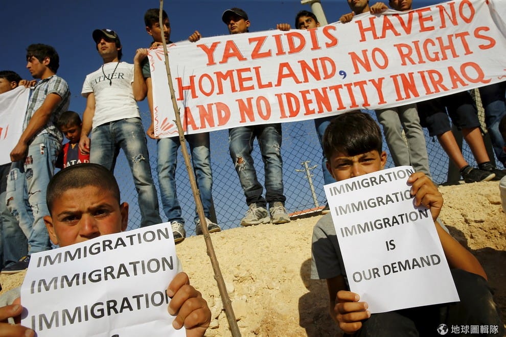受到迫害的亞茲迪人們舉著牌子:「亞茲迪人在伊拉克沒有家,沒有人權也沒有身分」。
