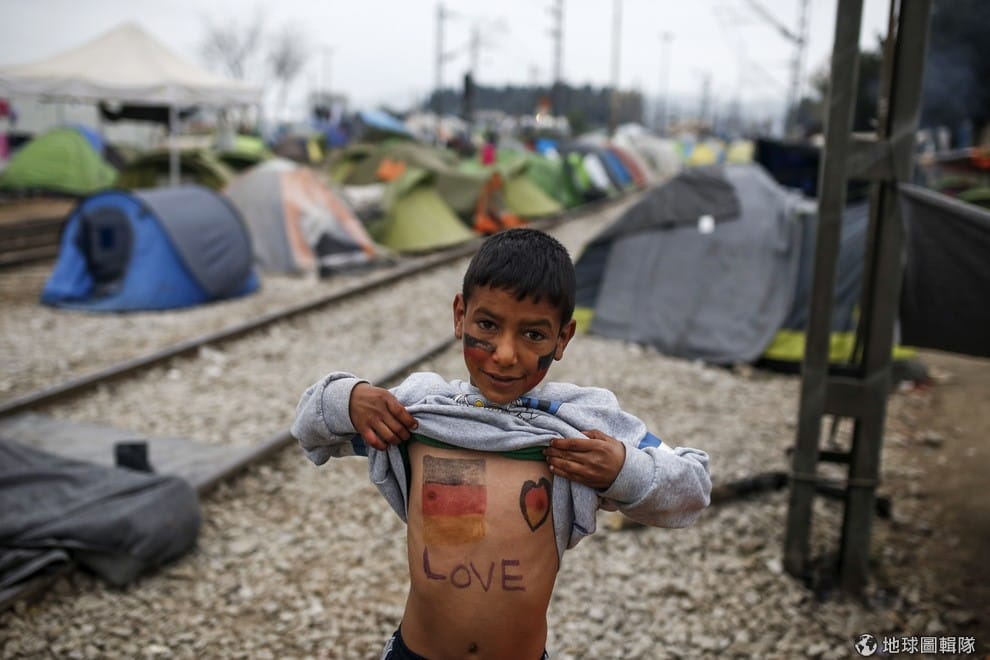 希臘靠近馬其頓的伊多梅尼當地,在難民收容區的小朋友對攝影師秀出胸前的德國國旗。許多難民將德國當成重生的地方,但不少人落腳之後卻有了不同的結論。