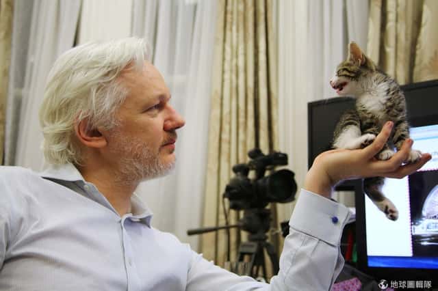 倫敦的厄瓜多大使館裡,維基解密(WikiLeaks)創辦人阿桑奇(Julian Assange)正看著他新養的小貓。阿桑奇的小孩送來這隻貓咪陪伴他,讓他在大使館裡的生活不會太寂寞。