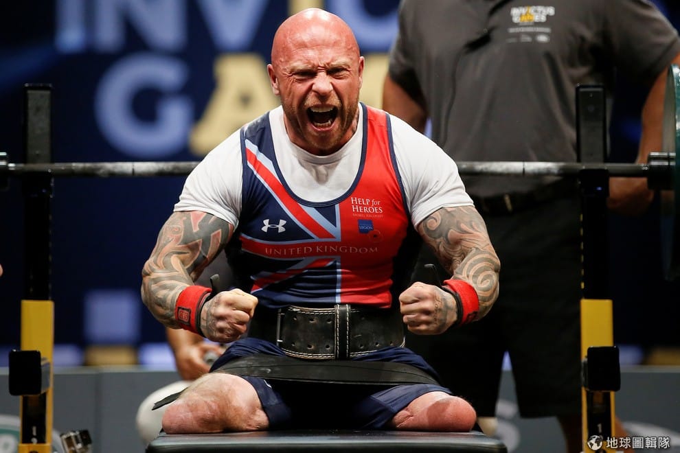 由列(Michael Yule)大聲吼叫,慶祝自己贏得輕量級舉重冠軍。根據報導,由列過去是名軍人,但 2010年的時候他在阿富汗踩到了一枚土製炸彈(IED),因此失去了雙腳。受傷的他開始用運動來復健,並在這次的「勇士不敗」運動會(Invictus Games)拿下金牌。