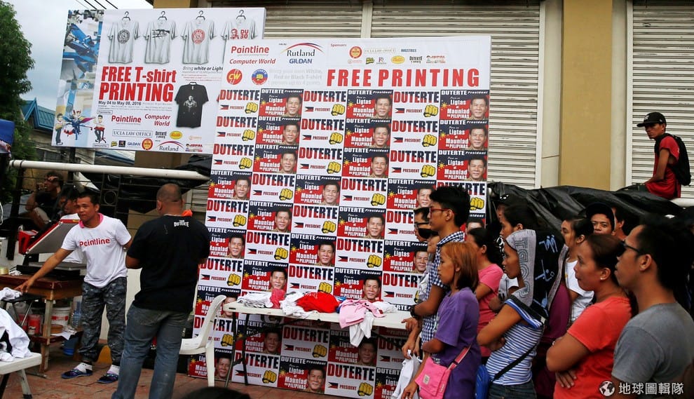 路透社支持杜特蒂的民眾排隊領取印有競選口號的T恤,用行動表示對杜特蒂的信心。