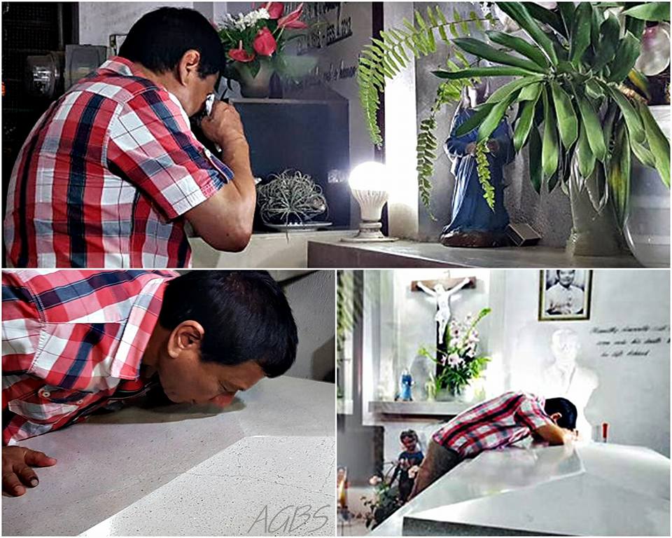確認當選後,新任總統杜特蒂來到父母的墓園哭泣,請求父母能給他力量領導國家。