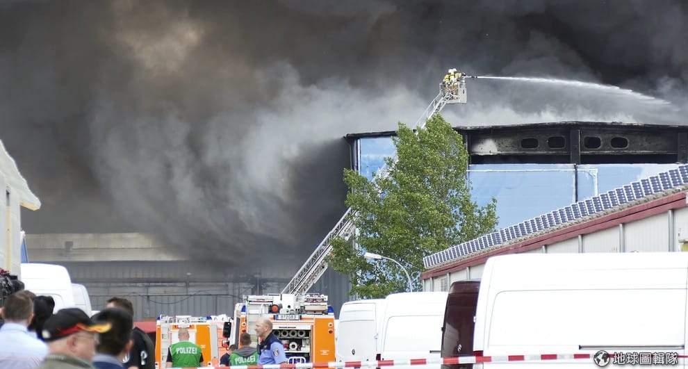 消防員站在雲梯上,對著燃燒的購物中心噴灑水柱。柏林最大的亞洲超市「東香購物中心」(Don Xuan Center)在 11號出現大火,超市的員工經過疏散後平安逃離,沒有人受傷。根據報導,火勢是從儲存指甲油的倉庫竄出,消防員也因此特別提醒現場的記者跟攝影師小心,不要吸入有毒的煙霧。後來消防部門的發言人表示,經過測量,空氣中的有毒物質濃度不高。