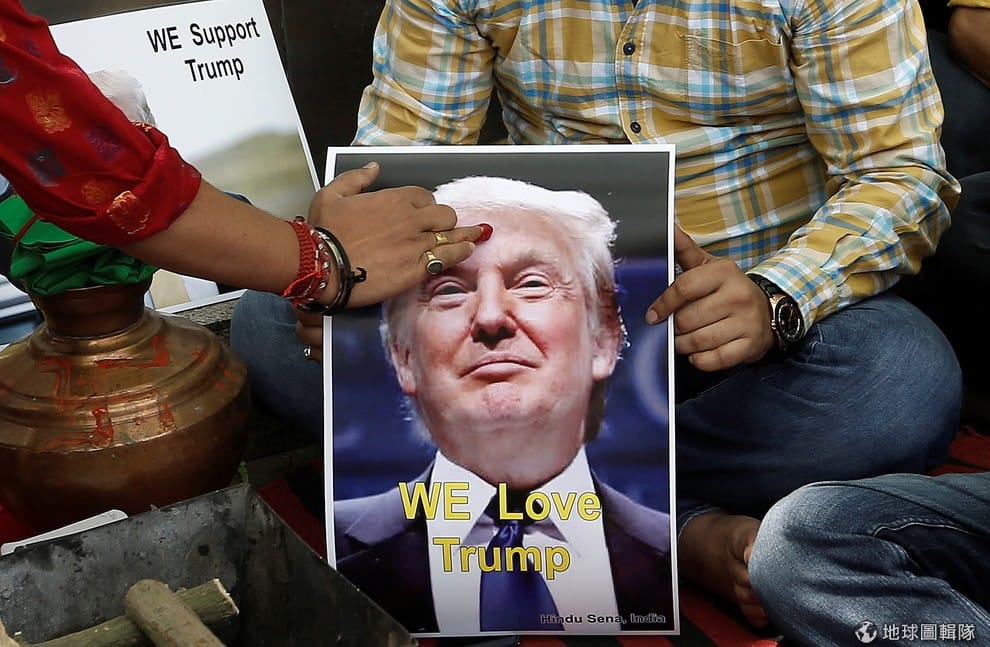 祭司在美國總統候選人川普的畫像上,點上一枚紅點(tika)。印度右派團體「印度教軍」(Hindu Sena)舉行一場祈禱活動,為川普祈求勝利,希望他順利當上美國總統。
