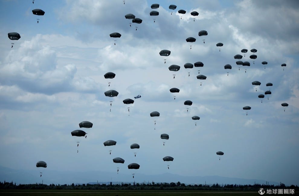 跳傘的傘兵一個個跳出軍機,他們正在進行以美軍為首的聯合軍演。