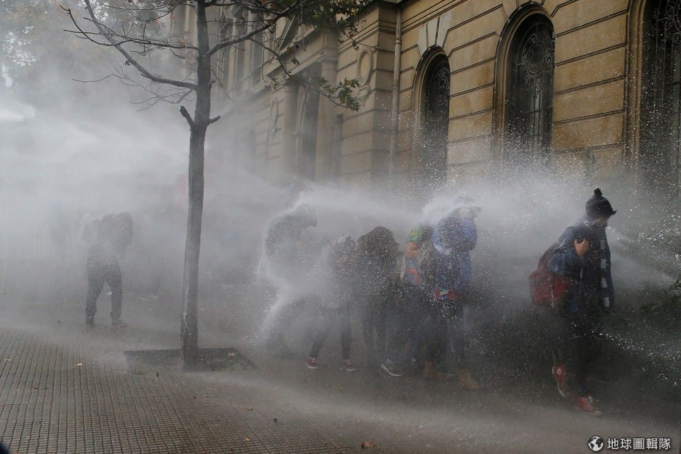 抗議學生們被鎮暴警察發射的水柱噴到。11號時,8萬名學生在聖地牙哥(Santiago)市遊行抗議,要求改變教育體制。根據報導,今年 1月,智利政府推出一項計畫準備要讓窮苦的學生免繳大學學費,同時也承諾在計畫第一階段會幫助 70%的最窮學生。但由於經濟不好,政府取消了原本的目標,想要實施免學費計畫也變得相當困難。