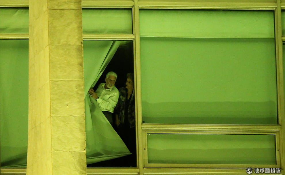 巴西總統羅賽夫(右,Dilma Rousseff)從總統府的窗子往外看。根據報導,羅賽夫被指控在 2014年大選前操控財務,好隱藏逐漸增長的政府赤字,經過參議院投票後,決定對羅賽夫進行審判。羅賽夫審判期間將暫停總統職務,目前由副總統泰梅爾(Michel Temer)暫時接任總統。由於審判期可能會長達 180天,因此巴西奧運開跑的時候,羅賽夫有可能會缺席。