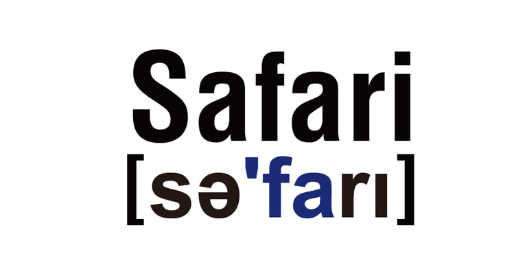 (O)[sə'farɪ] Safari這個字的本意指打獵、冒險,特別是指在非洲草源上打獵冒險式的旅行,也是蘋果電腦開發的的瀏覽器的名字。它的重音在第二個音節。重音唸錯了完全像另一個字suffering,意思是吃苦,差很大。