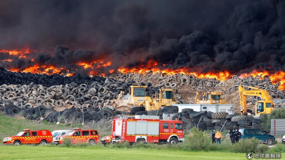 消防員看著熊熊燃燒的大火。西班牙塞塞尼亞(Sesena)鎮的輪胎廢棄場竄出大火,冒出有毒煙霧,當地官員表示居民的健康有可能會受影響,下令疏散塞塞尼亞的 9,000名居民。許多居民已經自行離開,只剩大約 1,000人還留著。