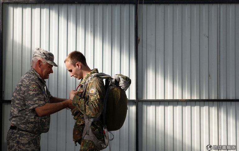 俄國葉爾莫洛夫軍事學校(General Yermolov Cadet School)的學生準備要進行跳傘,現場一名指導員正在協助學生。