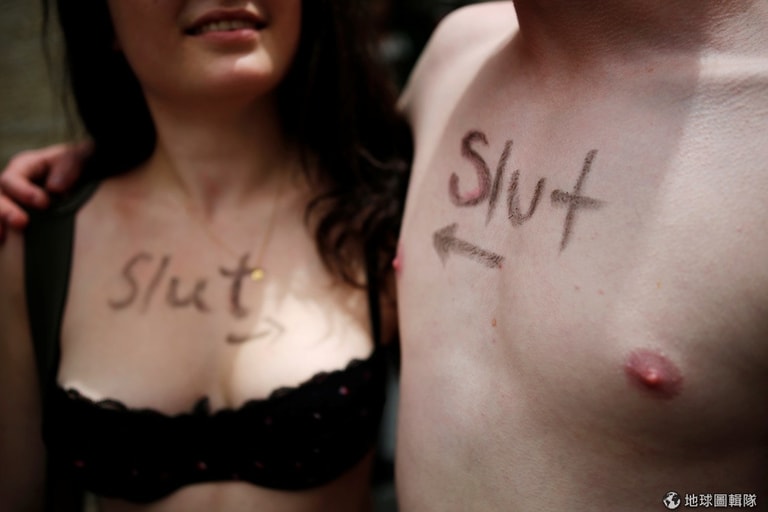 示威者在胸前寫上「妓女」(slut),參加「妓女上街抗議」(SlutWalk)活動。妓女上街抗議活動開始於 2011年,當時一名加拿大多倫多警察表示,女人應該避免穿得像個妓女以避免被人性騷擾。