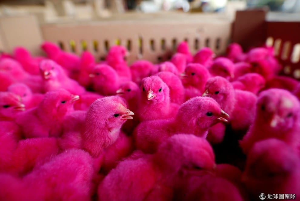 雅加達的市場上,一隻隻小雞被染成鮮豔的桃紅色等著出售。