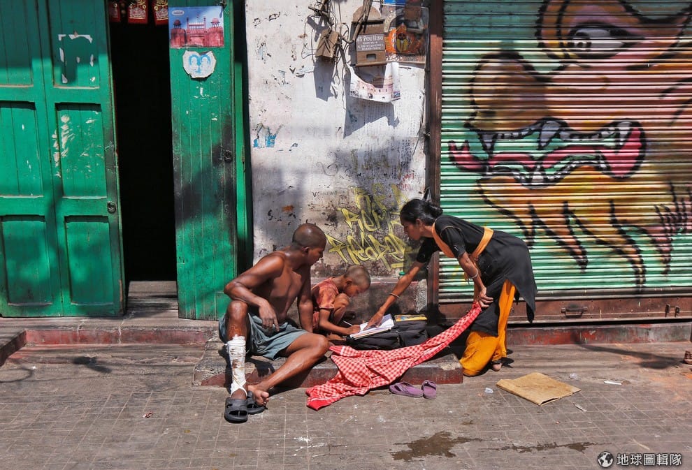 沒有自己家的維肖(左,Vishal Rana)、奇蘭(右,Kiran Rana)夫妻在一家店門口教 6歲的兒子念書。